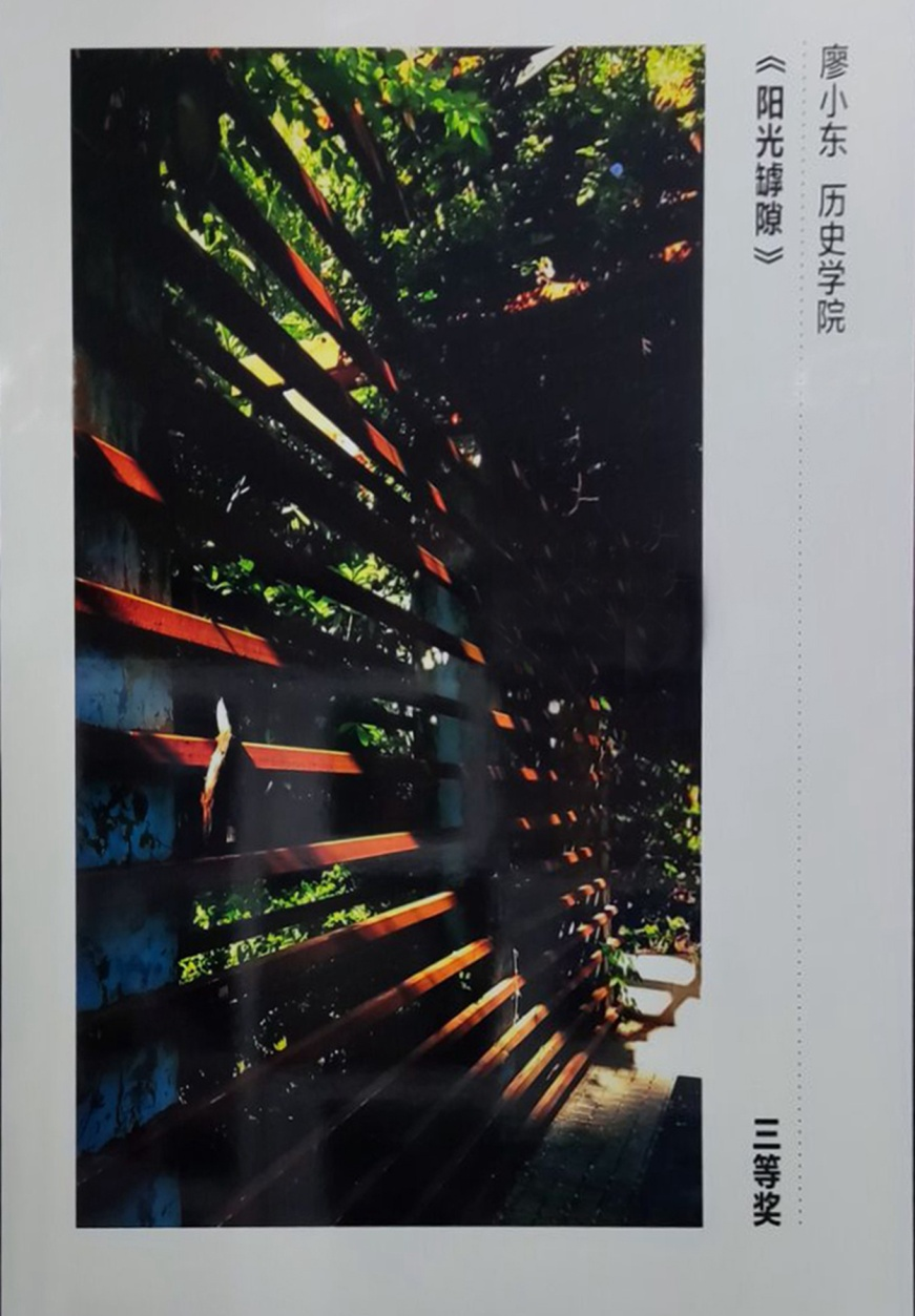近日,学校举办了“喜迎二十大·缤纷珞珈”摄影展,bwin必赢廖小东老师的参赛作品《阳光罅隙》获得艺术类三等奖,该作品摄于汉林广场,一束阳光透过长满蔷薇藤的栅栏照射下来,使幽暗的藤蔓中突显着希望与温暖。